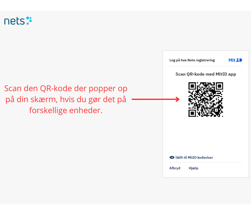 7. Bruger du en anden enhed, skal du scanne den QR-kode, der popper op på din skærm, med den enhed (ofte din mobiltelefon), hvor MitID-appen er.