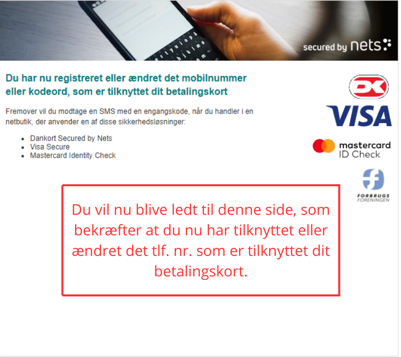 13. Du vil herefter blive ledt til en side, der bekræfter, at du har registreret eller ændret det telefonnummer eller det kodeord, der er tilknyttet dit betalingskort.